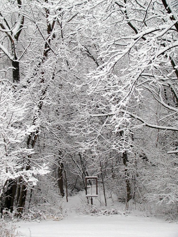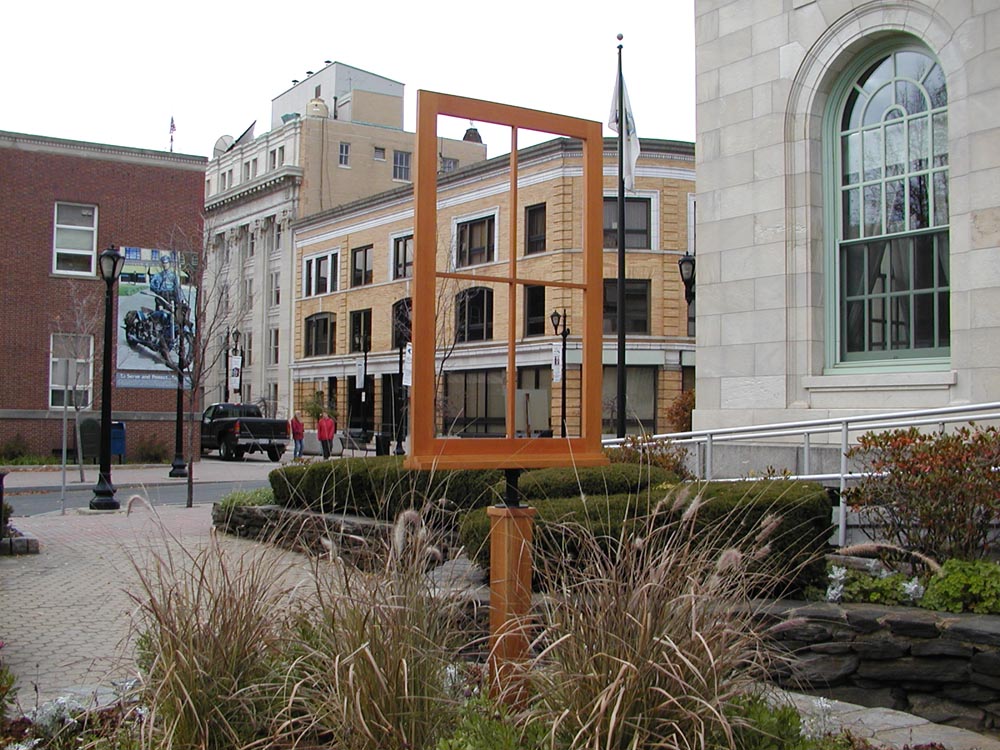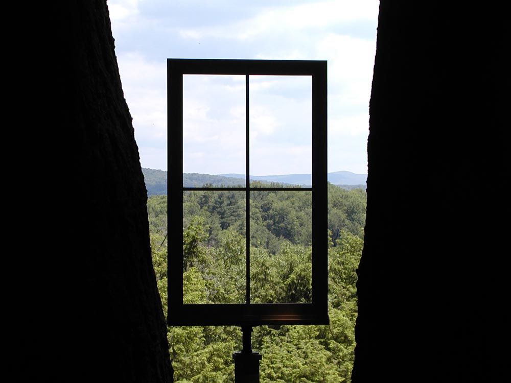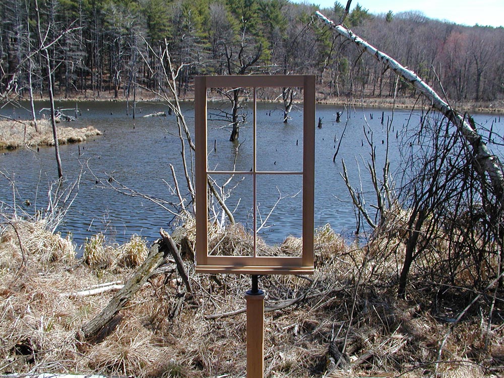 Room with a View was created as a site-specific installation at the Chesterwood Museum in Stockbridge, MA. The idea for the installation came from finding "artifacts" in the woods behind my parent's house. As a child, these old car frames and building foundations seemed to belong to ancient civilizations. Even when engulfed in thick undergrowth, these objects were strangely out of place. Room with a View is constructed of white cedar. Proportions of the window are based on the golden mean or golden rectangle. The window frames objects in its environment and creates a virtual barrier in the negative space surrounding it. It is a lost object, part of its environment but incongruent at the same time. Room with a View was part of Contemporary Sculpture at Chesterwood in 2002. It was then installed outside of City Hall in Pittsfield, MA. as part of the ArtScape project. It currently sits at the edge of the woods in my yard where it ages gracefully while providing a perch for chickadees and a summer home for spiders.