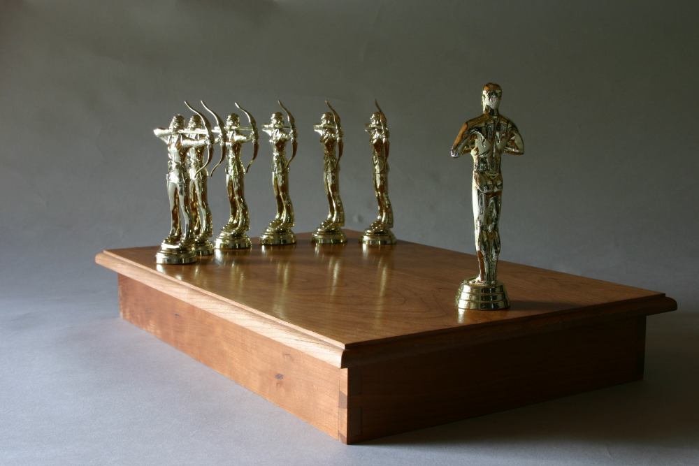 The layout of this piece is based on the golden mean. The archers arranged in a semi-circle at one end and Sebastian stands stoically at the other end in counterpoint to the arc of archers at the opposite side. The base is made of highly varnished cherry, which provides an interesting interplay of reflections and shadows. The corners of the base are dovetailed together – a link to my past with Shaker furniture making.