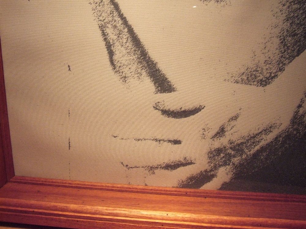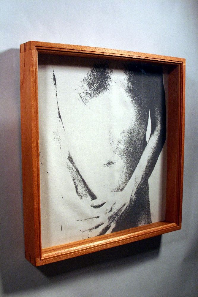 Production began with a digital photograph of me in the same “pose” as the Shroud of Turin. The photo was then cropped to match Avedon’s portrait of Warhol and passed through filters to make it look more like the shadowy images on the Shroud of Turin. Scars were digitally added in a pattern similar to Warhol’s. The modified image was used to create a life-sized positive print on acetate that was burned onto a silk screen emulsion. A screen print was made on muslin and mounted in a mahogany and glass case.