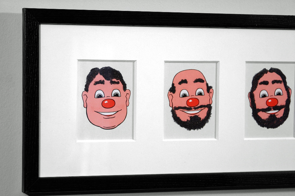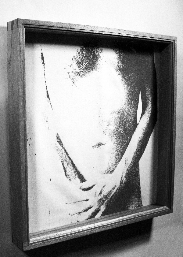 Serigraph on cloth, wood and glass, 20 x 19 x 2.5 in.